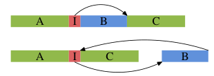 图中上面的部分表示一个简单的代码布局。例如如果B区域是由内联函数inlfct生成的,并通常因为判断条件导致不会执行而是跳过,而处理器预取到的缓存行里,却包含这个鲜有被执行的B区块。通过代码块重排可以解决这个问题,如上图中的下半部分所示。经常执行的代码被线性的放在内存中,而不常执行的代码则被移动到其他不影响预取和L1指令缓存效率的地方去。